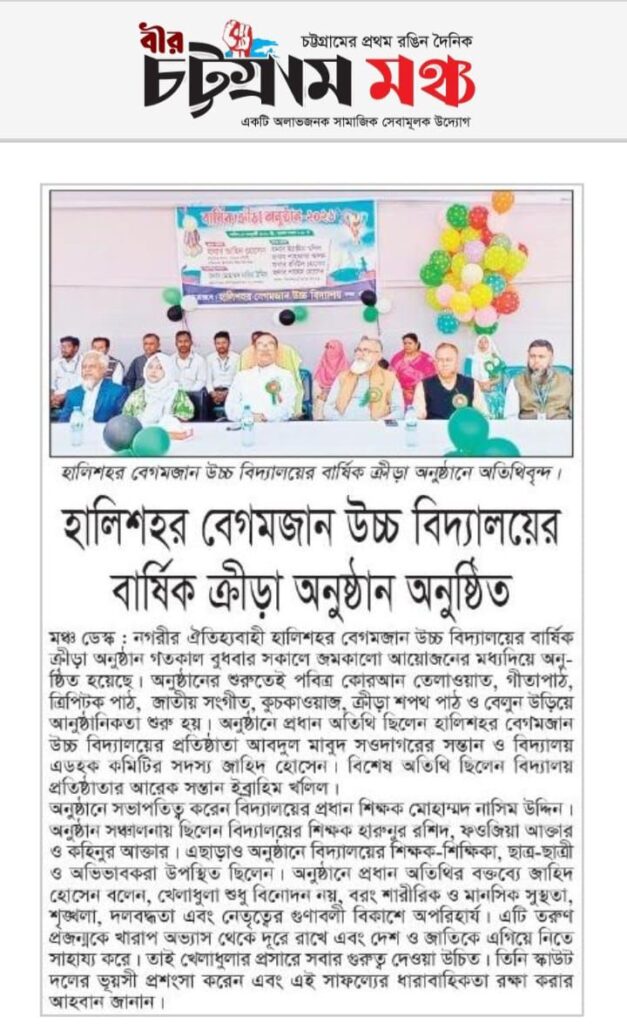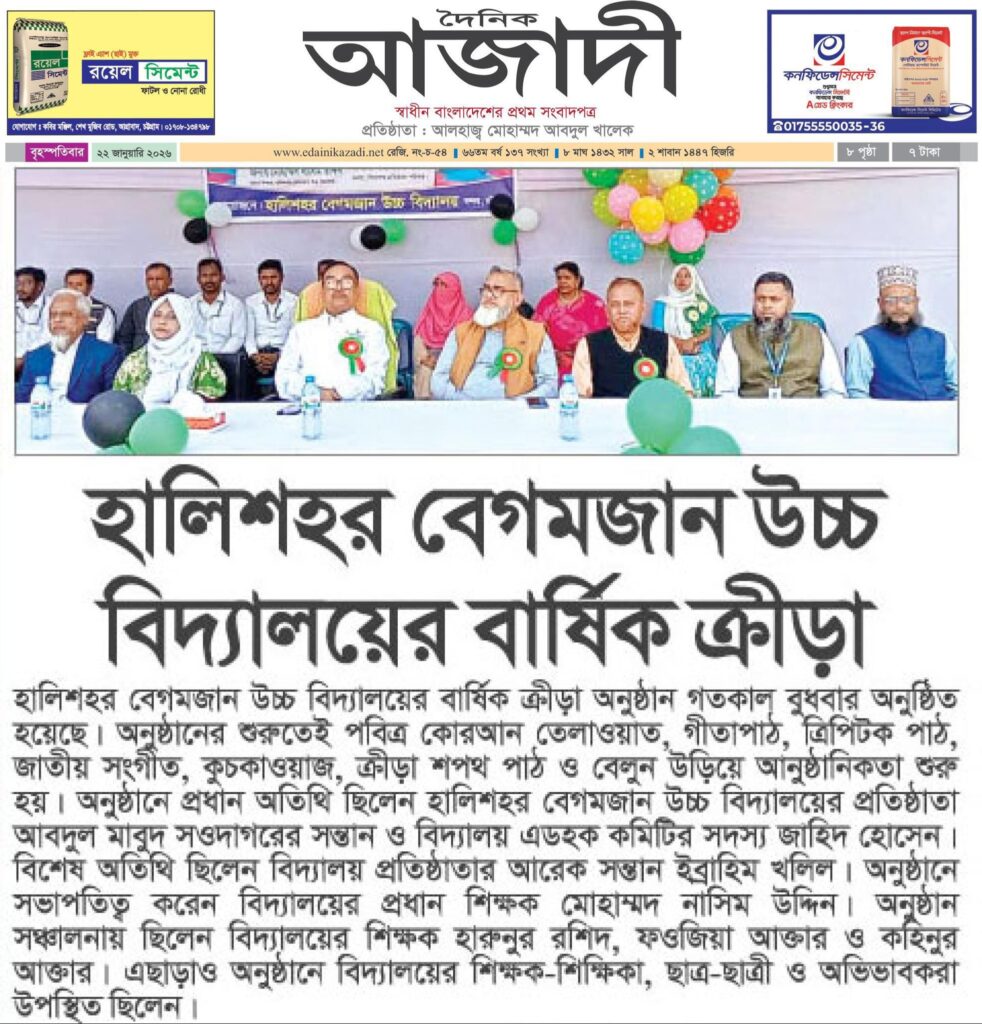 চ্ট্টগ্রাম বন্দর নগরীর ঐতিহ্যবাহী হালিশহর বেগমজান উচ্চ বিদ্যালয় এর বার্ষিক ক্রীড়া অনুষ্ঠানের পুরস্কার বিতরণ ও সাংস্কৃতিক অনুষ্ঠান গত ২৭ জানুয়ারি ২০২৬ ইং তারিখে অনুষ্ঠিত হয়। এতে প্রধান অতিথি হিসেবে উপস্থিত থাকেন বিদ্যালয় এডহক কমিটির সদস্য জনাব জাহিদ হোসেন মহোদয়সহ অন্যান্য গণ্যমান্য ব্যক্তিবর্গ।
